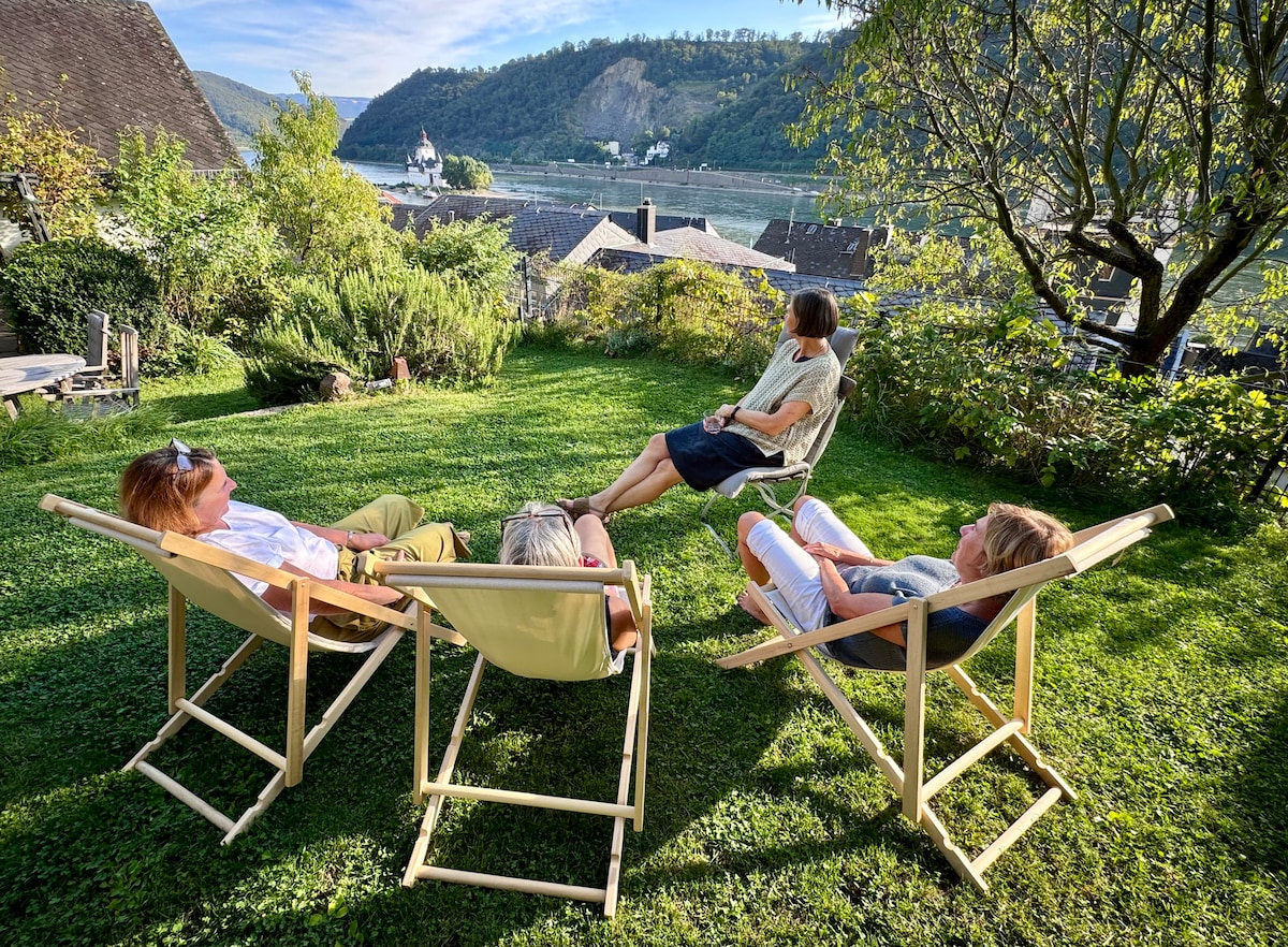 Découvrez un panorama rhénan à couper le souffle et charmant au-dessus des toits en ardoise d'une ville médiévale ! L'ancienne mine d'ardoise ensoleillée est située au niveau des rochers sous le château de Gutenfels, directement sur le sentier de randonnée « Rheinsteig ». La propriété fait partie du patrimoine mondial de l'Unesco et d'un sanctuaire faunique. Profitez de la terrasse ombragée avec une tonnelle de vigne, de l'entrée mystérieuse de la grotte de la mine, du jardin d'herbes traditionnel, du vert relaxant isolé et de la vue panoramique.