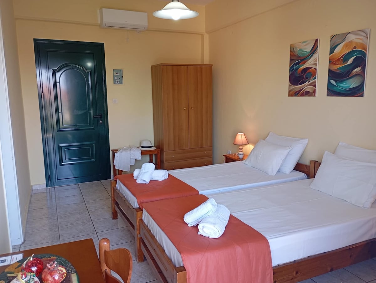 Les appartements Myrtia sont deux appartements magnifiques et confortables, constituant une alternative parfaite pour des vacances en famille abordables ! L'espace entièrement équipé est prêt à répondre et à satisfaire vos besoins de détente et d'indépendance. Les hamacs sur les terrasses deviendront votre endroit préféré pour une « siesta » estivale sous les oliviers ou pour un verre de vin le soir. Anna et Spiros
