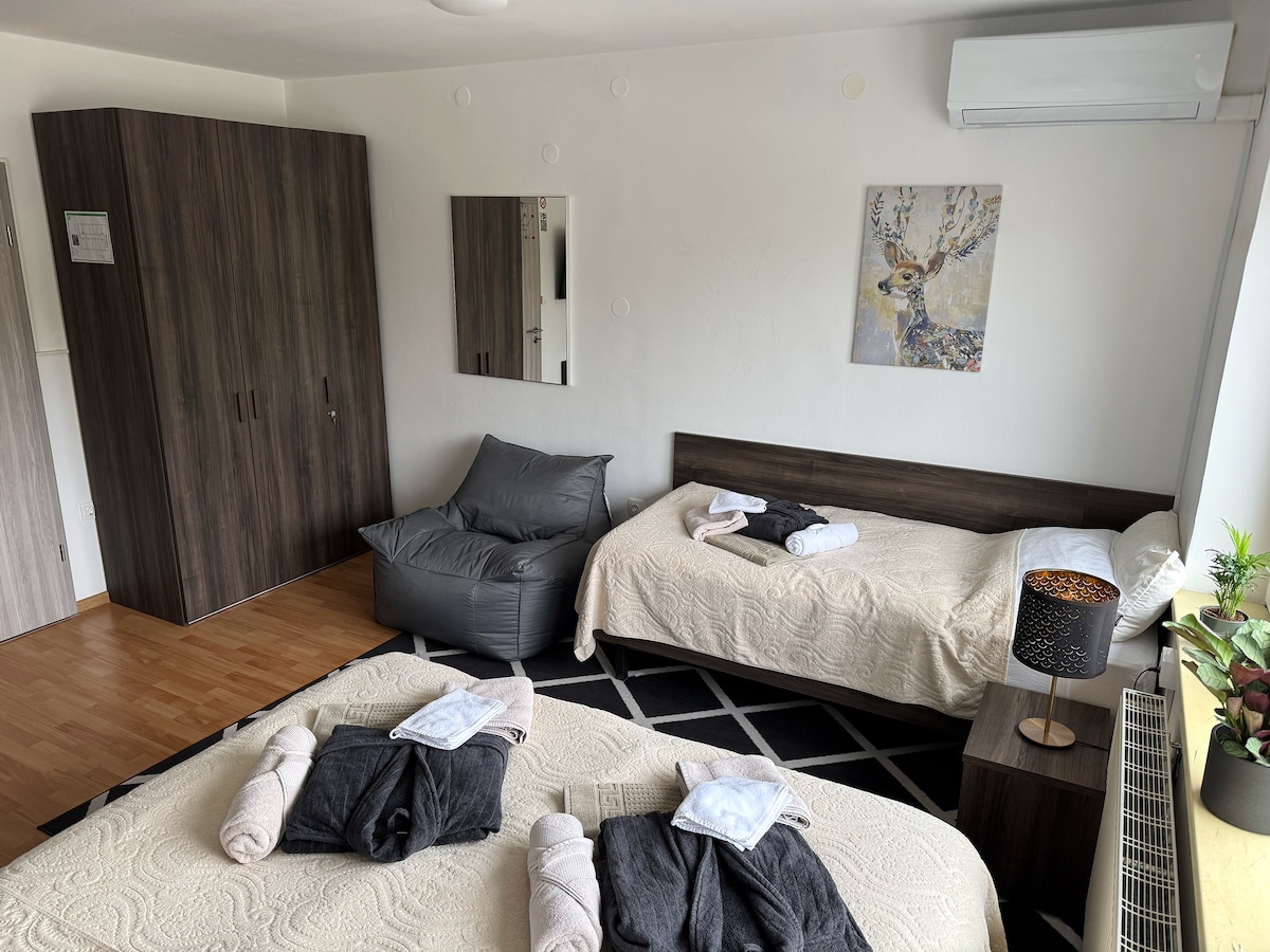 Our grand two-bedroom apartment includes its own fully fitted and equipped kitchen with a dining area, a sofa that can be used as a sleeping area for up to 2 people, and a bathroom. It also includes 2 separate bedrooms with a king-size bed.
