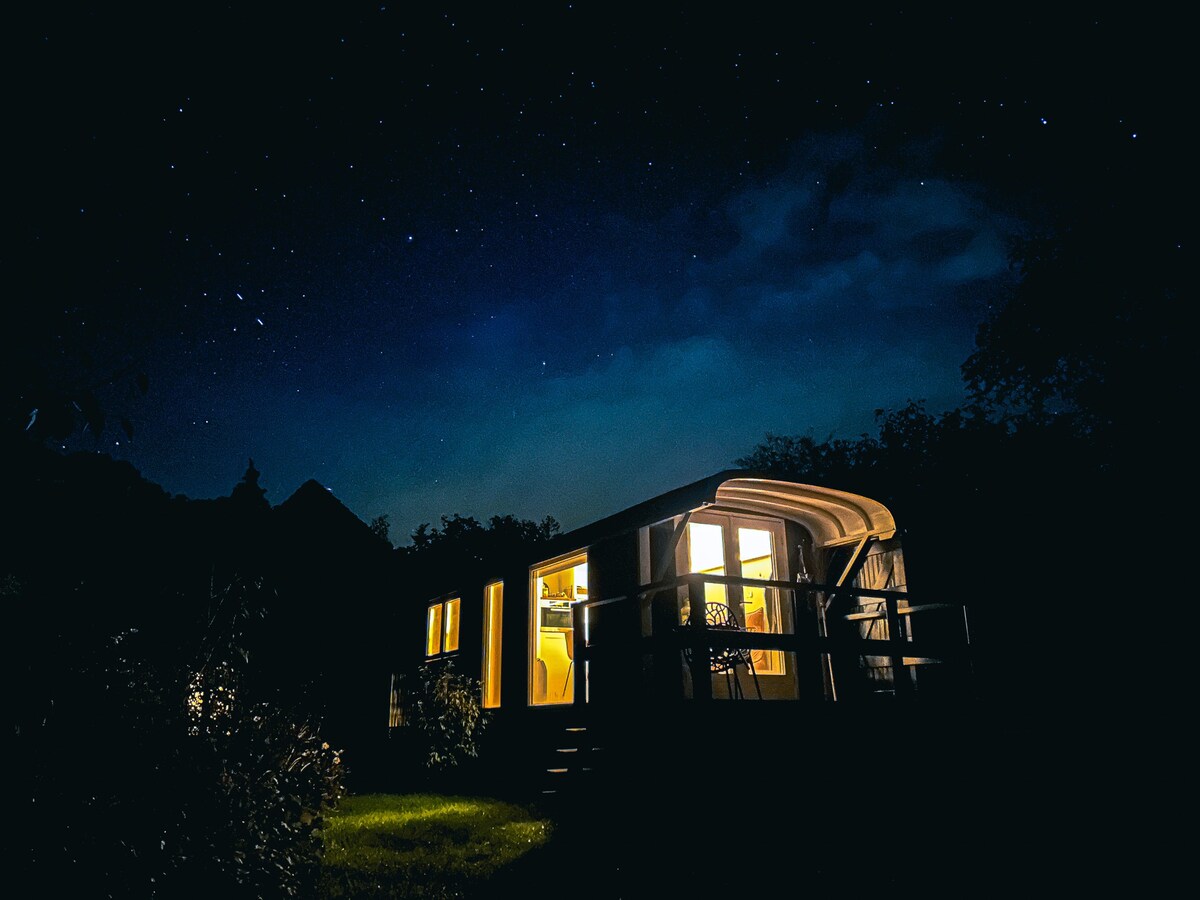 Le luxe au cœur de la nature : cette spacieuse roulotte romantique dispose d'une cuisine entièrement équipée, d'une merveilleuse baignoire avec vue sur le ciel étoilé, d'un lit fantastique et d'une fenêtre panoramique qui vous permet de profiter de chaque lever et coucher de soleil. Depuis le spa, vous pouvez profiter d'une vue panoramique et peut-être même apercevoir des animaux sauvages! Détendez-vous dans un quartier calme. (Consultez également notre autre annonce pour notre autre chalet dans le verger.)