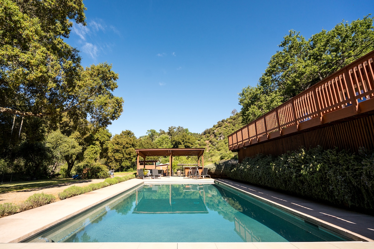 Cet endroit est magique. Sept acres privés avec une vue à 360 degrés sont entourés de vignobles que vous pouvez voir à travers la plupart des fenêtres. Sur la propriété, selon la saison, vous trouverez des pommes, des poires, des pêches, des cerises, des figues, des néfliers, des kakis, des grenades, des noix de pécan, des châtaignes et plusieurs cépages. L'espace extérieur comprend un patio couvert enveloppant, des repas en plein air, plusieurs espaces salons, des foyers, des balançoires, des jeux et une cuisine extérieure. C'est vraiment unique en son genre.