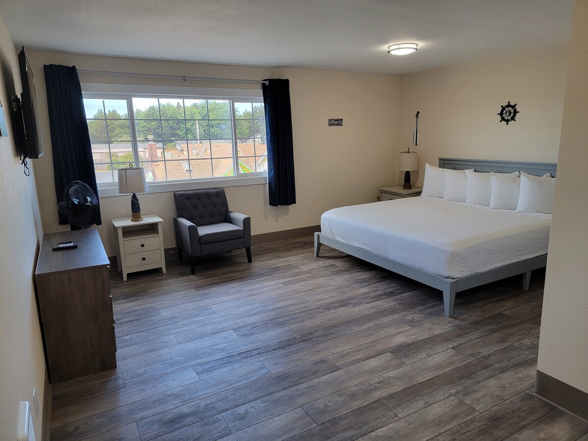 Chambre Queen Size confortable à South Bay Inn : confort moderne au bord de la baie Bienvenue dans la chambre Queen du South Bay Inn, où le confort rencontre le style ! Cet espace soigneusement conçu offre tout ce dont vous avez besoin pour une escapade relaxante. Doté d'une kitchenette, de douches carrelées avec pommeaux de douche à effet pluie et d'un lit queen size ultra-cozy, vous ne voudrez peut-être plus jamais partir. Sortez pour profiter de la vue magnifique sur la baie, prenez un verre à l'air libre ou défiez vos amis à une partie de cornhole ou d'autres jeux de jardin.