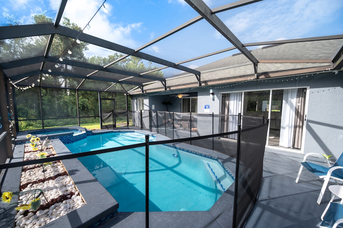 Profitez de cette belle maison de 4 chambres avec piscine privée * qui vous tient à proximité de tout ce que la région offre ! À seulement 35 minutes de l'aéroport d'Orlando, à 20 minutes des parcs Disney, à 4 minutes d'un Publix Super Market, et à quelques minutes de plusieurs restaurants et terrains de golf à proximité. *Si vous souhaitez que la piscine soit chauffée, le coût est de 30 $ par nuit, et le chauffage doit être ajouté pour l'ensemble de votre réservation.