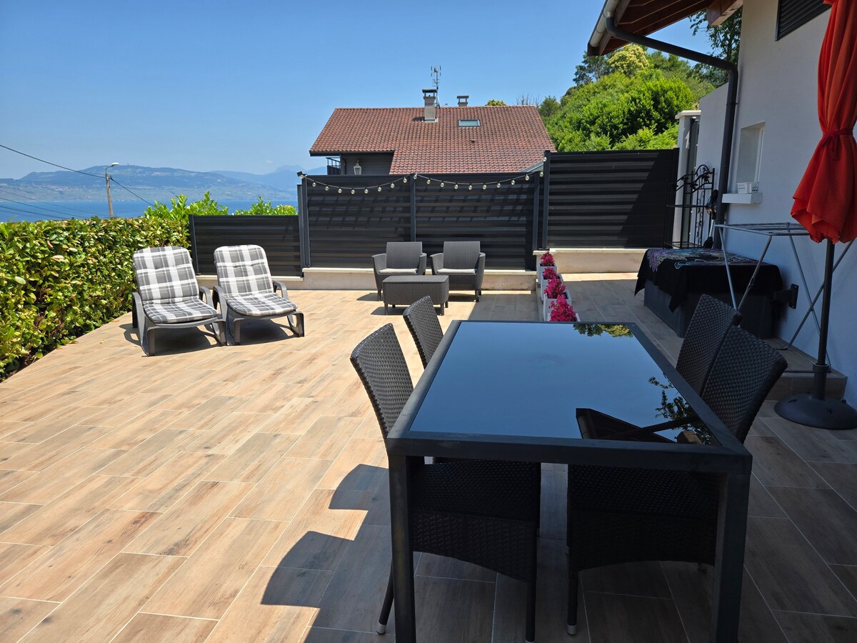 Appartement neuf dans vieille grange en pierre avec vue panoramique sur le lac Léman et sur le château d'Allaman , arrivée autonome et espace extérieur privé, pour 4 personnes avec 1 grand lit et un canapé convertible, . Cuisine toute équipée, baignoire , wifi, T.V, machine à laver, sèche linge , garage. Calme et confort. Plage toute proche, Evian à 5 km, pistes de ski à 10 min en voiture, golf 18 trous à 6 km, thermes et piscine à 5 km, accrobranche à 14 km, frontière suisse à 15 km.