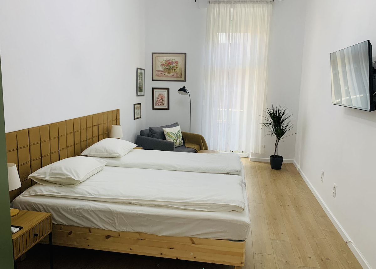 Our 40 sqm apartment is perfect for couples, good friends, or small family. The studio has a private entrance from the community corridor, a dining room, a well-equipped kitchen, a bathroom with shower, a cozy living room and a gallery room with a double bed. A soothing modernist interiors emphasizing comfort, harmonized proportions, and calming color palettes. The studio is by the Danube Riverside, steps from the Margaret Bridge, and surrounded by coffee shops, cafes, and restaurants.