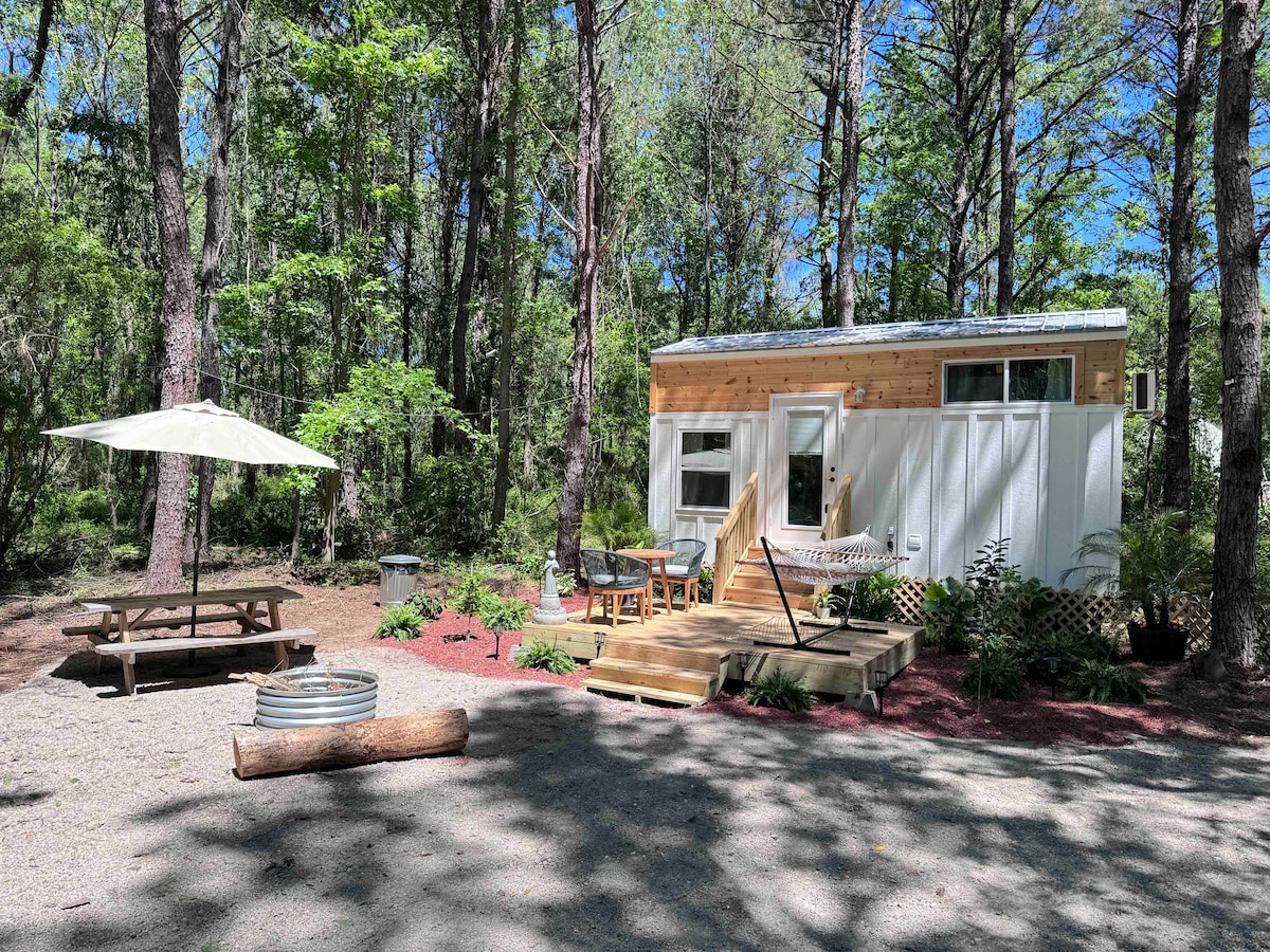 CHAI TINY HOME au sanctuaire forestier d'Alachua 🌴 Situé dans une oasis de nature. Profitez d'une retraite tranquille. 🚙 Très proche pour les clients visitant le Temple de l'Univers de Michael Singer (environ 1 mile) À 💦 25-45 minutes en voiture de plusieurs superbes sources naturelles d'eau douce. À 25 min de l'Université de Floride ou du centre-ville de Gainesville. À 15 min des commerces. 🐄 Veuillez noter que l'espace et le terrain sont végétariens. Veuillez maintenir un régime végétarien lorsque vous êtes sur le terrain, merci ! 🌝 Chaï réservé à vos dates ? Envoyez un message à l'hôte ou consultez Shanti Tiny Home.