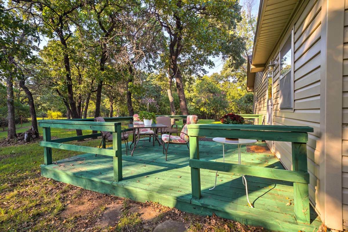 Détendez-vous avec toute la famille dans cette paisible maison de campagne de style ranch sur 10 acres. Les porches couverts à l'avant et à l'arrière donnent sur les pâturages de chevaux. Prenez un café sur le patio à l'arrière ou lisez un magazine dans la balançoire sur le porche avant. Gril Weber à l'arrière avec des lumières pour les rassemblements en soirée et une cheminée pour l'ambiance. Plusieurs grands pacaniers créent un verger ombragé pour les oiseaux sauvages, les dindes et les cerfs. Propriété fermée avec allée pavée.
