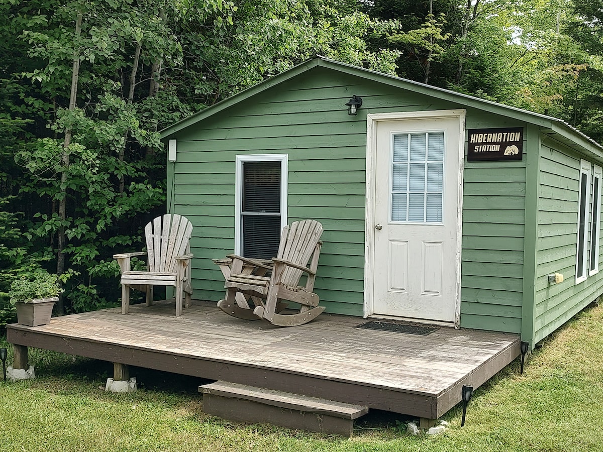 Détendez-vous et rechargez-vous dans notre magnifique chalet niché dans les montagnes Adirondack dans un petit parc de caravanes. Studio avec salle de bain privée. Un grand lit et deux lits de camp sont disponibles. Il y a un petit espace cuisine avec un évier, un micro-ondes, une cafetière à dosettes et un mini-réfrigérateur. La salle de bain comprend une douche debout, des toilettes et un lavabo. Vous pourrez profiter de l'espace extérieur qui est équipé d'une table de pique-nique et d'un foyer. Vue imprenable sur le lac Chateaugay et le ciel nocturne.