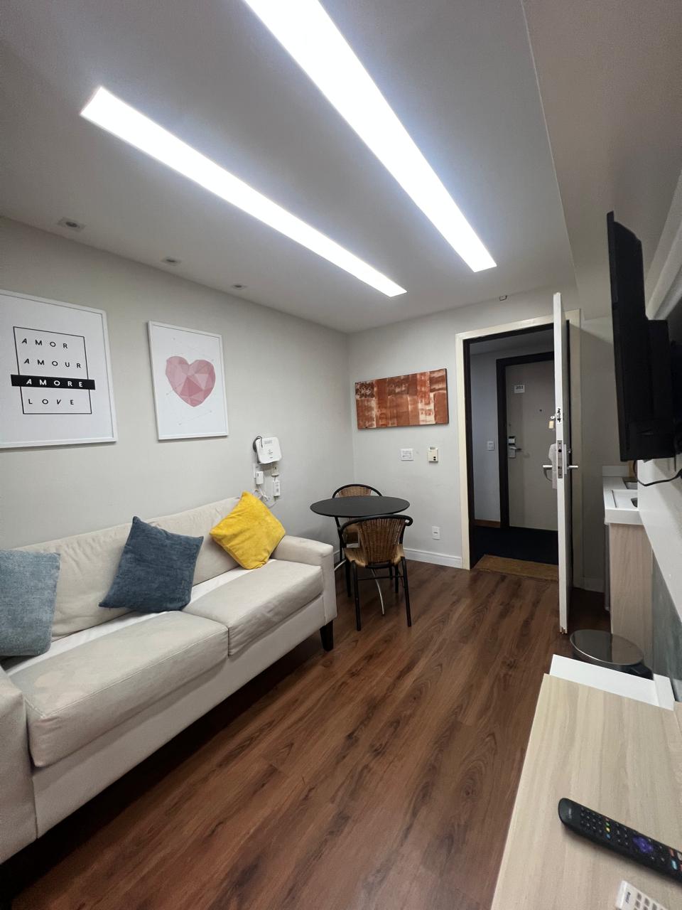 - Décor moderne, vue sur la mer ; - Confort : climatisation, balcon, rideaux occultants, Internet, lit king size, serviettes, draps, oreillers, savon et papier toilette, eau chaude. - Bureau : bureau et chaise confortables avec lampe et prises de courant. - Cuisine pratique : ustensiles de cuisine, micro-ondes, mixeur, cafetière, sandwicherie et minibar ; - Condominium : concierge 24h/24, piscine, sauna et salle de sport.