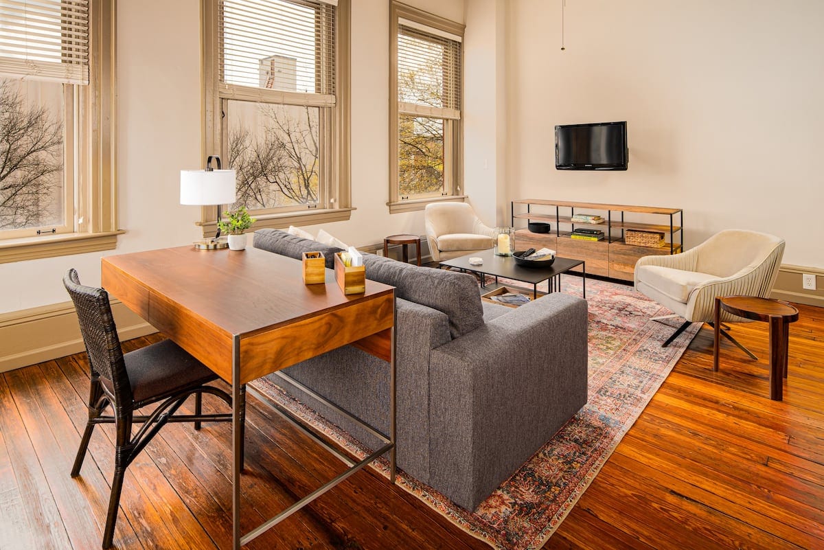 Ce loft bohème chic est situé au cœur du centre-ville de Macon. Profitez des bars et de la bonne cuisine, à distance de marche de la vie nocturne de Macon. Idéal pour les couples qui souhaitent passer un long week-end, pour les voyageurs d'affaires et même pour ceux qui ne font que passer par Macon pour rejoindre leur destination finale. Ce loft offre des chambres spacieuses qui comprennent une chambre avec un lit King Size et un canapé convertible dans le séjour pouvant accueillir jusqu'à 4 personnes. Le salon et la chambre disposent d'une télévision avec Roku.