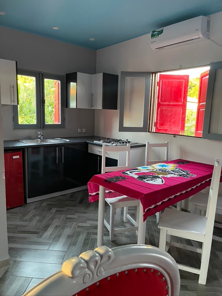 Magnifique studio au 1er étage. Vous bénéficierez de tout le confort de l'appartement dans le tarif indiqué : - cuisine équipée (frigo S, induction, gaz en cas de coupure d'électricité malheureusement fréquente sur l'île), - climatiseur, - TV Canal+, - eau chaude, - accès à internet, - accès à la piscine - et ménage durant le séjour. Le matelas est de marque VITAFOAM en qualité premium, gage d'une nuit réparatrice et paisible. Fenêtre de marque française à double vitrage.