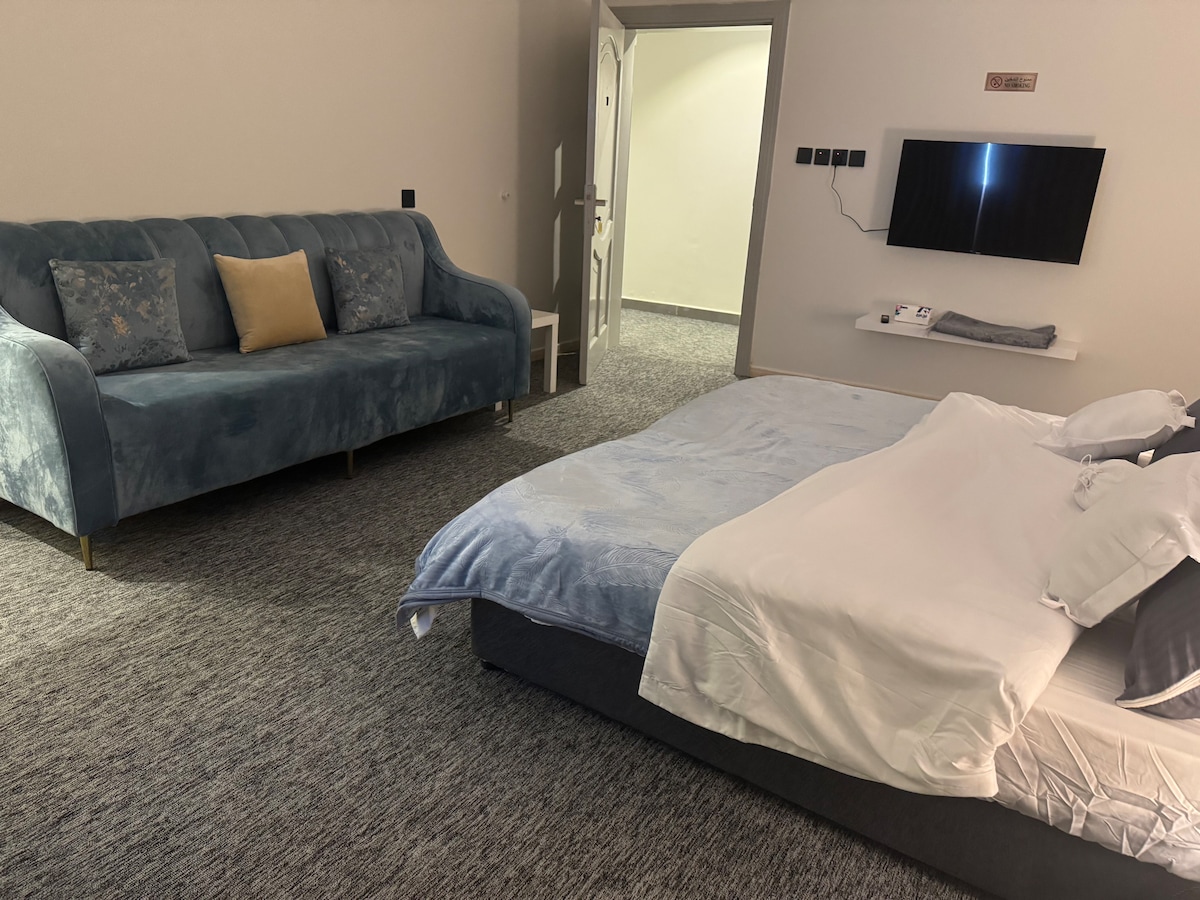 Un studio moderne, au cœur de Médina, qui peut accueillir ses visiteurs, composé d'un lit royal, d'un jacuzzi rafraîchissant à eau chaude et froide, de toilettes intégrées, équipé de tous les besoins de soins personnels, d'une télévision intelligente avec plusieurs chaînes et d'une connexion Wi-Fi. De plus, comme nous vous y avons habitué, nous sommes là pour célébrer chaque instant avec vous grâce à l'hospitalité gratuite et au service à la clientèle 24 h/24 et 7 j/7, pour faire de votre séjour une expérience inoubliable.