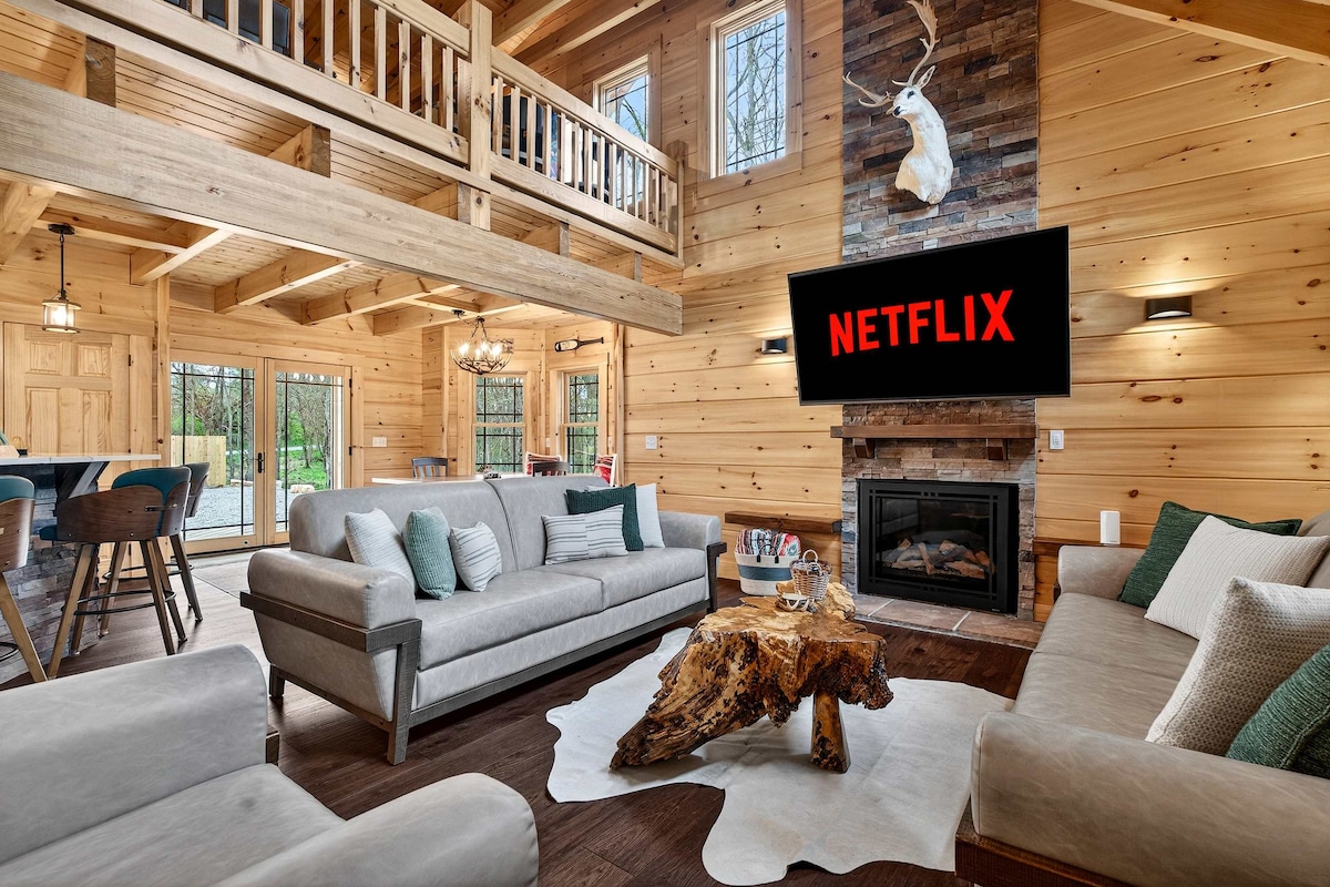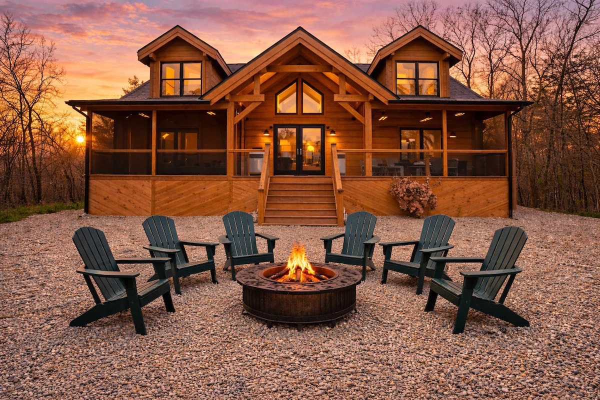 Depuis le jacuzzi bouillonnant, profitez de l'air de la campagne et de la tranquillité de cette magnifique cabane de 48 acres (entièrement privée) de deux chambres et deux salles de bain située entre l'Arche et le Musée de la Création. Dégustez une tasse de café ou un verre de vin autour du majestueux foyer donnant sur les prairies vallonnées. Profitez d'étangs immaculés (avec des fontaines LED) pour pêcher et nager. Regardez les cerfs et les dindes parcourir la propriété. Parcourez les sentiers qui comprennent un parcours de golf de frisbee conçu pour admirer le paysage.