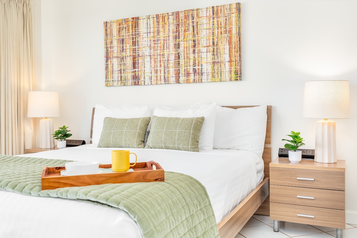 Situé à côté de Hilton Village sur le Waikiki Strip dans l'hôtel Aqua Palms. Entièrement rénové en décembre 2025. Profitez des feux d'artifice à Dukes Lagoon tous les vendredis à 19 h 45, marchez jusqu'à la plage (5 min), le centre commercial Ala Moana (12 min), les restaurants locaux, la vie nocturne de l'île et plus encore ! Meublé et décoré avec soin pour un style de vie hawaïen moderne et confortable. 3 minutes à pied du service de location de voiture à l'heure/à la journée - Drive Hui. Économisez de l'argent pour le stationnement!