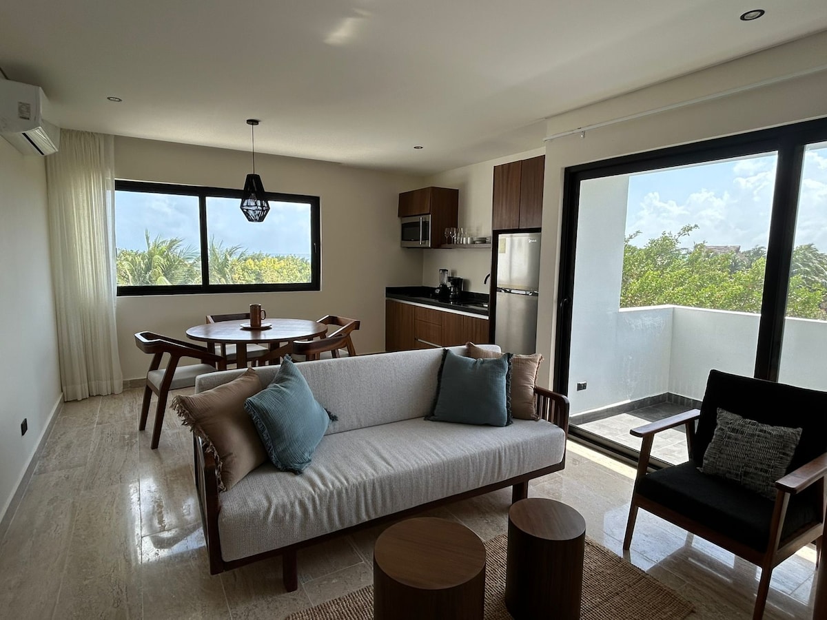 Disfruta un departamento cómodo y funcional en Mahahual, ideal para descansar y disfrutar unos días cerca del mar. Cuenta con cama amplia, cocina equipada, aire acondicionado, WiFi y un espacio abierto que brinda comodidad y buena iluminación natural durante todo el día. Desde el departamento podrás apreciar una vista parcial hacia el entorno natural y el mar. Además, tendrás acceso a las áreas comunes del condominio, perfectas para relajarte durante tu estancia.