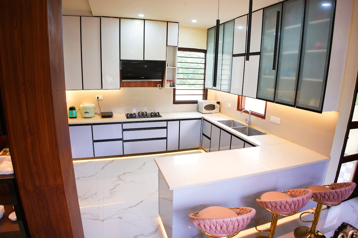 Retraite paisible de 2 chambres dans un endroit isolé, parfaite pour la détente ou l'exploration spirituelle. La maison dispose d'une pelouse à l'avant, d'un stationnement pour 2-3 voitures, de deux salons, de chambres confortables avec climatisation, de toilettes attenantes et d'un balcon privé. Une cuisine qui assure la commodité. À seulement 3 minutes à pied de Radha Soami Satsang Beas Koharchhan, à 7 km de la gare d'Amb Andaura, à 15 km du temple Chintpurni et à 37 km du temple Jwalaji. Profitez d'un environnement serein à proximité des principales attractions.