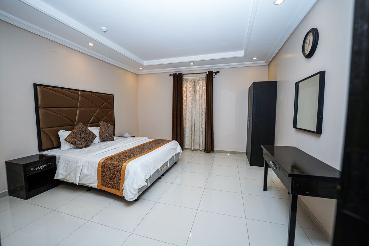 Chambre et salon bohémiens intégrés alliant confort et style Parking privé Lit de matelas confortable pour lit d'hôtel Rangement de chevet Armoire en verre élégante Une coupe de cheveux élégante avec un design moderne Écran 4K de 65 po Coin café avec tous les accessoires Le réfrigérateur est assez grand pour garder des boissons. Équipé avec soin de produits de bain jetables Salon calme et élégant Doté d'un emplacement distinctif à l'écart de Airport10d Au bord de l'eau 14 m Al Jawhara Court 18 m À côté de tous les services
