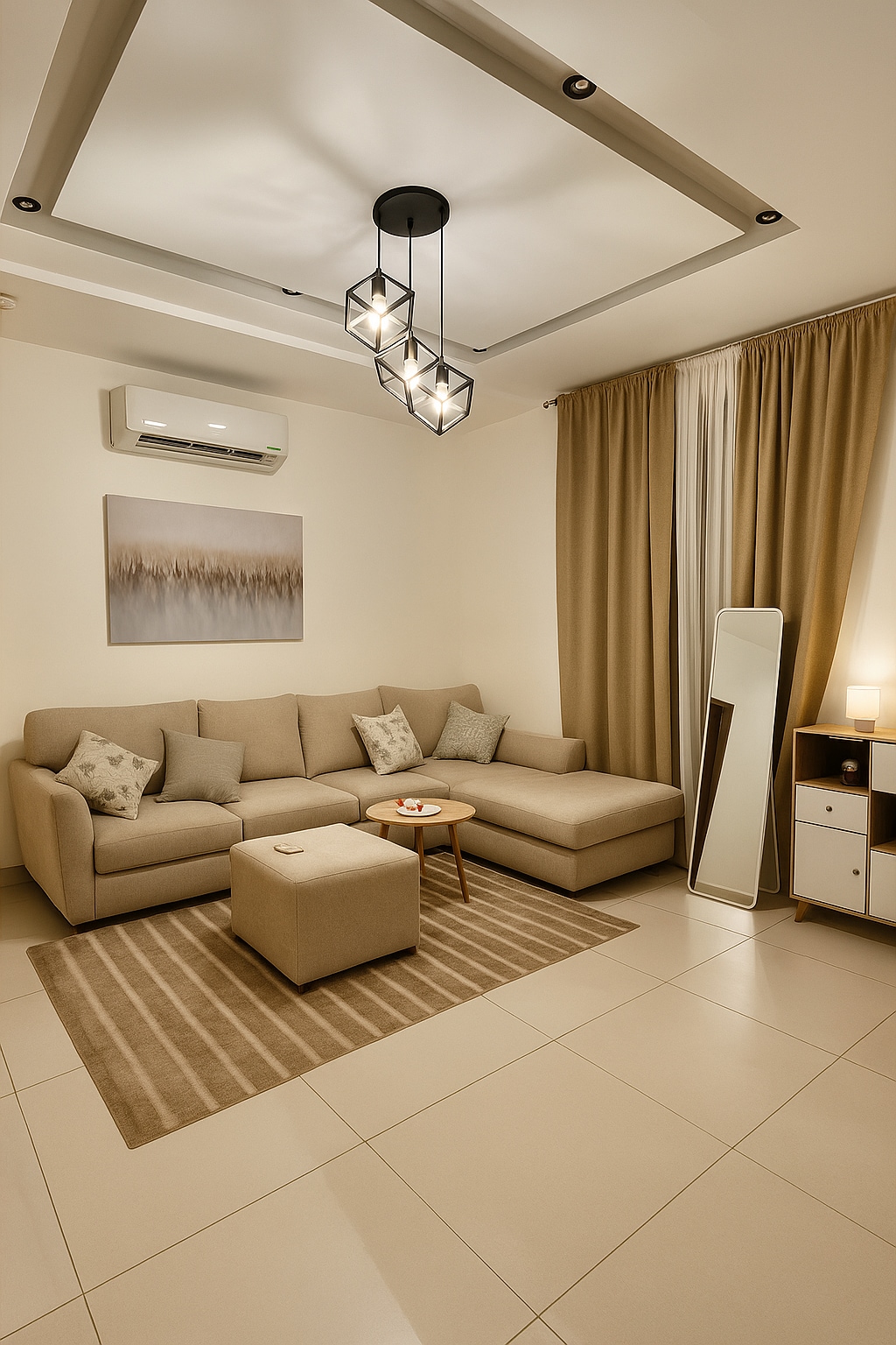Vous profiterez d'un logement élégant et central. Un appartement modeste au centre-ville peut être « le point de départ idéal pour explorer la ville », spécialement conçu pour ceux qui aiment les styles modernes chaleureux. En voiture: L'aéroport est à 15 minutes. Corniche 16 minutes Piste de Formule 1 à 15 minutes Centre commercial Red Sea à 16 minutes Mall of Arabia à 8 minutes. À pied : Laveries à 5 minutes Supermarché à 5 minutes.