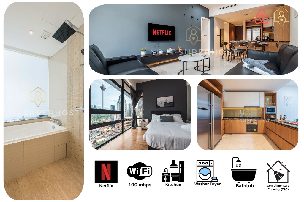 > Appartement rare dans la zone KLCC @ Grande zone de construction pour un appartement d'une chambre de luxe d'environ 86 m ² > La salle de bain dispose d'une baignoire avec vue sur la ville Sécurité stricte > 24 heures sur 24 > À 10 minutes à pied des tours jumelles Petronas. > Télévision LED intelligente avec Wi-Fi chargé avec Netflix et l'application YouTube > Wi-Fi haut débit de 300 mbps > Nous fournissons un purificateur d'eau afin que les voyageurs puissent profiter d'une eau potable de qualité pendant le séjour > Matelas de la série hôtelière, bureau, Smart TV, lave-linge, sèche-linge et ustensiles de cuisine