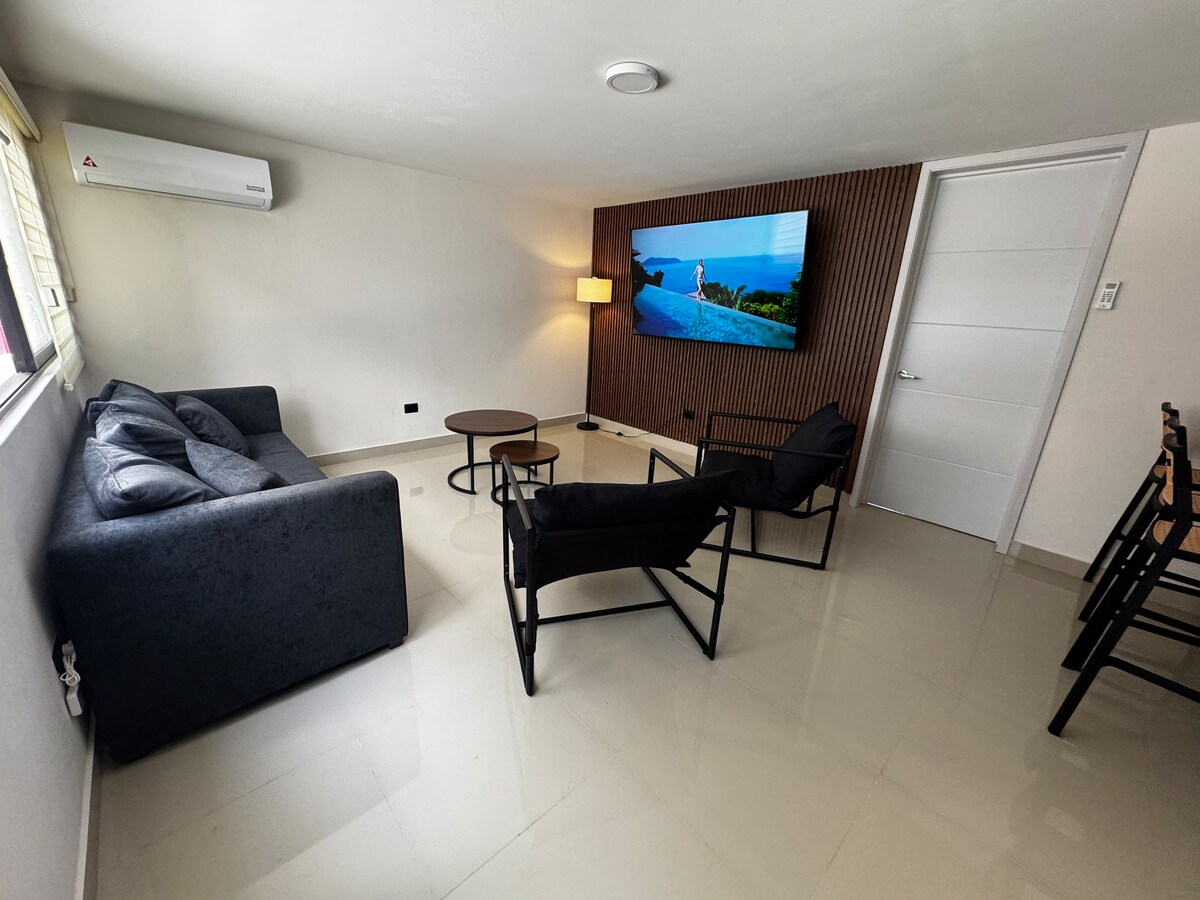 Bel appartement à 30 mètres de la plage de Mazatlán, confortable et élégant, dans un excellent emplacement, très proche des meilleures activités que vous pouvez apprécier dans le port : à 5 minutes de l'Aquarium, du Phare et du Mirador de Cristral, à 5 minutes à pied du Muchacho Alegre, à 5 minutes à pied du plongeur, sur l'une des plages les plus populaires et les plus belles de Mazatlán, il est situé à 10 minutes à pied d'Olas Altas, un endroit où vous pourrez profiter des bars, des boîtes de nuit des restaurants et des meilleures vues