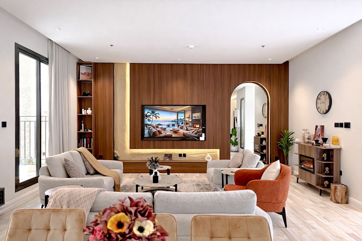 Penthouse de luxe avec entrée indépendante, comprenant deux chambres, un salon, une salle de cinéma, un espace extérieur avec des sièges, et deux salles de bain entièrement équipées avec du shampoing, des pantoufles, des serviettes et des mouchoirs. • Situé dans le complexe Rasf – District de Qurtubah Le téléviseur du salon et le projecteur de cinéma donnent tous deux accès à toutes les principales plateformes. (Netflix, YouTube et plein d'autres). Le logement est situé à un emplacement stratégique, à proximité de : • Front de Roshn (Front de Riyad) – 6 minutes • Aéroport international Roi-Khalid – 15 minutes
