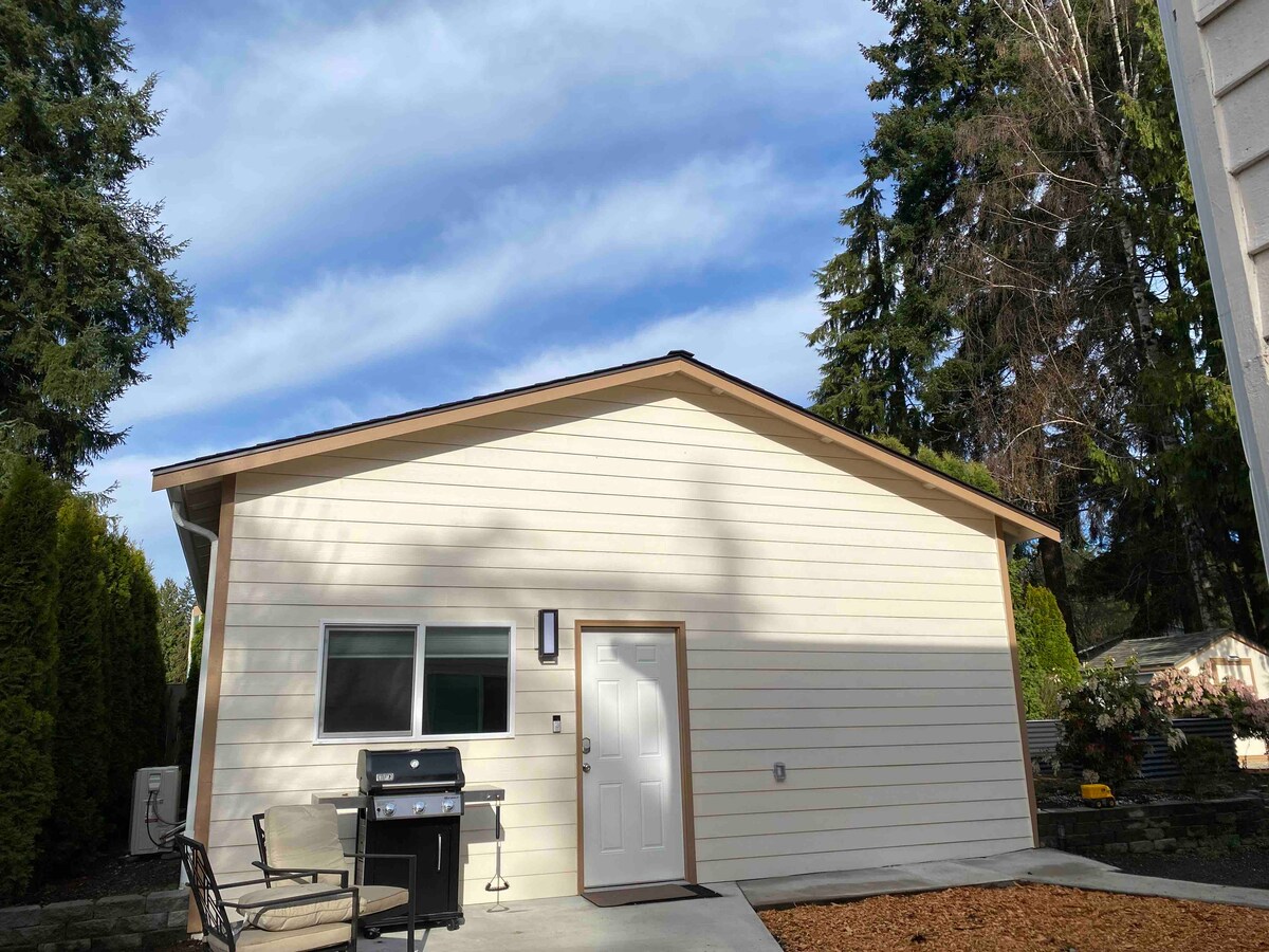Cette maison d'une chambre entièrement équipée est située sur cinq acres boisés, en face de l'allée de la résidence principale de l'hôte. Dans le passé, la maison était utilisée par mes beaux-parents. L'emplacement est très calme avec un sentier de randonnée sur place à travers des arbres à feuilles persistantes majestueux. Nous sommes à moins d'un mile de commerces et de restaurants. Nous sommes à moins d'une demi-heure de route de Seattle et Everett, dans l'État de Washington.