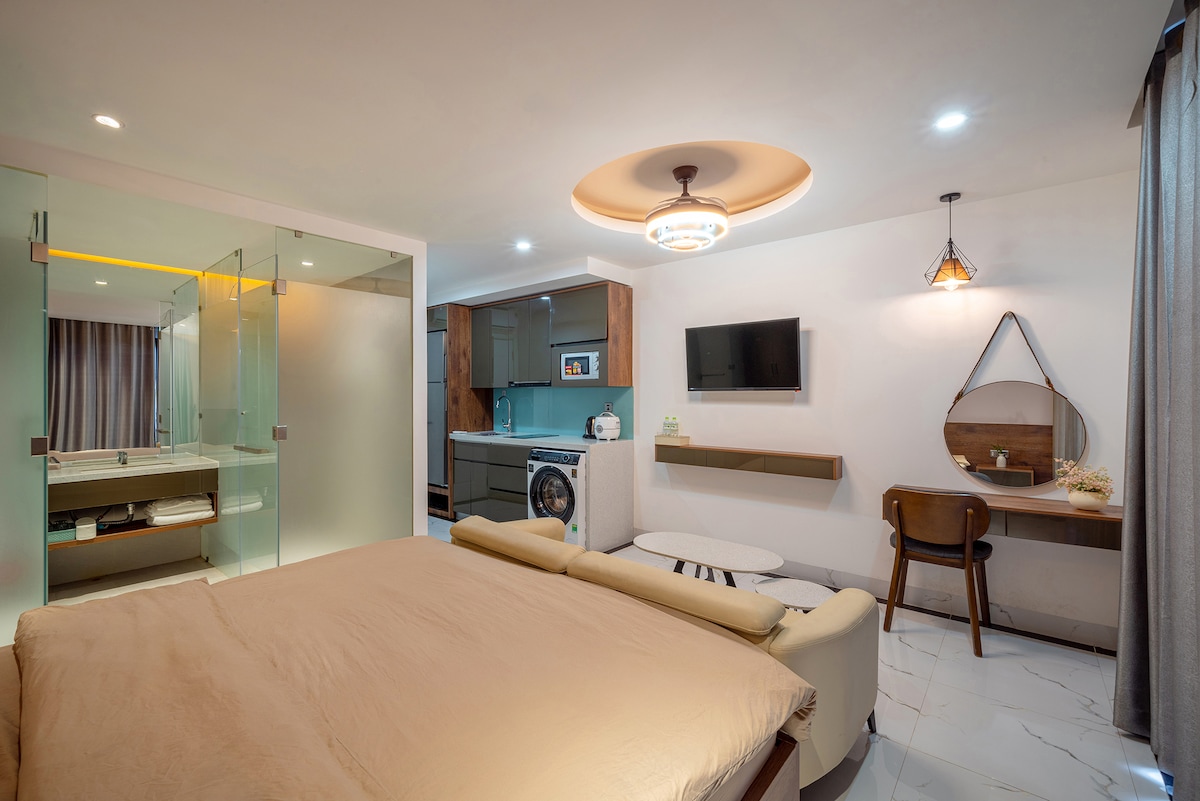 Cet appartement de luxe offre une chambre séparée et une cuisine complète, à seulement 500 m de la plage de My Khe, l'endroit idéal pour votre escapade. L'appartement fait partie d'une jolie petite villa de 3 niveaux. Dans le charme unique de la villa, vous trouverez des escaliers au lieu d'un ascenseur, un petit détail qui la rend encore plus chaleureuse et accueillante. Avec le slogan « May Home is where the heart is », vous vous sentirez toujours chaleureusement accueilli par notre équipe, avec un séjour confortable et inoubliable.