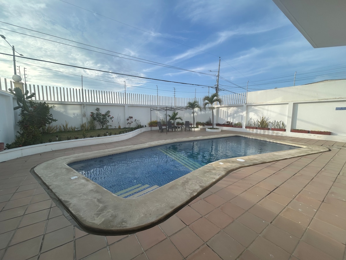 Parfaitement situé sur la plage de Canoa. À 8 minutes à pied des restaurants, des bars et du village de Canoa. Piscine incroyable, salle à manger extérieure, barbecue. Maison d'hôtes très confortable au bord de la piscine. Cuisine équipée, four, réfrigérateur, climatisation. Buanderie. Salon, beaucoup de places assises. Endroit idéal pour travailler dans un endroit calme. Bus devant la porte. Cabane de plage avec des sièges.