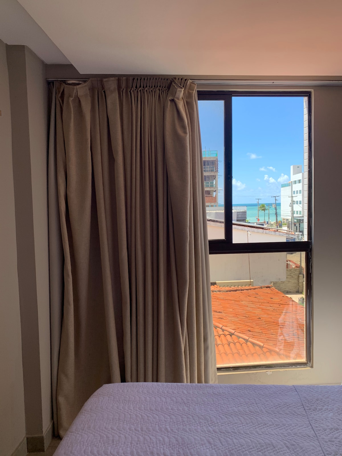 Flat com vista para o mar, localizado no bairro do cabo branco, 15 min do centro de convenções de João pessoa, 300m parada de ônibus. Acomodação possui, enxoval completo, varanda, internet individual gratis no quarto e internet por todo o empreendimento, piscina com borda infinita e restaurante no rooftop, smart tv led 49', ar condicionado, frigobar. Cozinha com cafeteira, micro-ondas, pratos, talhares, copos e taças, panelas e fogão. Máquina de gelo grátis, balde de gelo disponível no quarto.