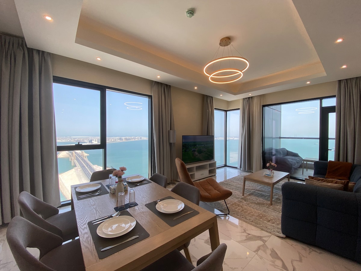 Bienvenue à Juffair ! Cet élégant appartement avec vue sur la mer est situé dans la tour Sukoon, qui est partagée avec le Hilton Hotel Bahrain. Le bâtiment est entièrement équipé et comprend deux piscines, des jacuzzis, des saunas, des terrains de basket-ball et des salles de sport. C'est un choix idéal pour les voyageurs d'affaires et de loisirs, situé à proximité des centres commerciaux et du centre-ville. À seulement 13 kilomètres de l'aéroport À proximité, vous trouverez une variété de délicieux restaurants, des cafés confortables, des boutiques uniques et de nombreuses activités à apprécier.