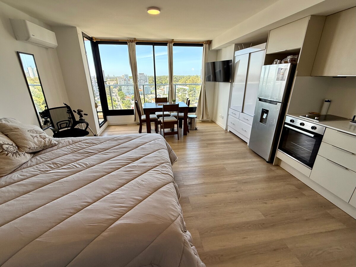 Détendez-vous dans cet espace si calme et élégant. Profitez d'une vue unique sur Punta del Este. Il dispose d'une chambre (ouverte), d'une salle de bain, d'une cuisine équipée, de la climatisation, du wifi, d'une télévision connectée, etc. un sommier 2 places et 2 matelas 1 place. Les meilleurs services : piscine ouverte et fermée, barbecue, garage, micro-cinéma, gymnase, jeux extérieurs pour enfants, salles (enfants, adolescents et adultes). Contactez-moi.