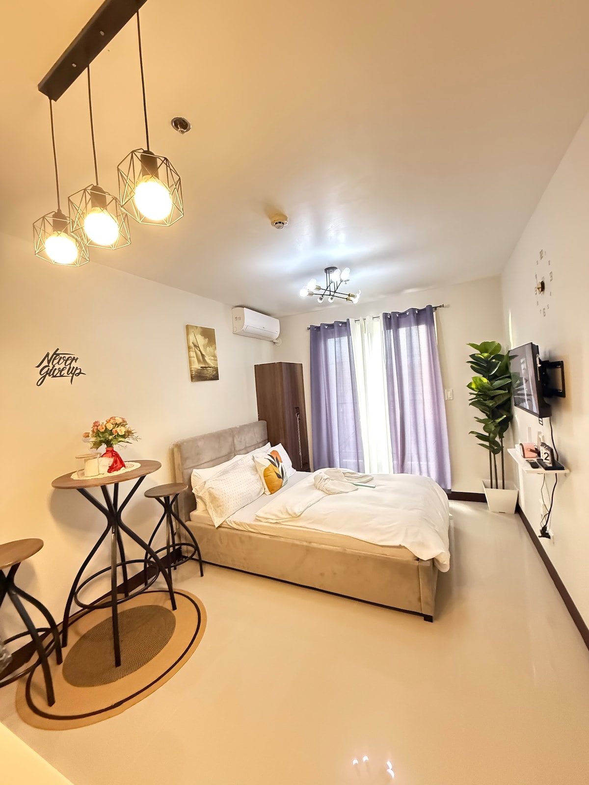 Accepter une réservation de dernière minute. Appelez-moi - Zero99Eight5852343☺️ Accès 24h/24 à l'aéroport de Mactan pendant 15 minutes. Possibilité de cuisiner. Près des plages publiques et privées de Mactan. À 1 trajet de Gaisano et de l'hypermarché. À 2 à 3 minutes à pied des supérettes comme le 11/07 et de la buanderie. Une cantine abordable est également à votre disposition. Situé au 16e étage par ascenseur.