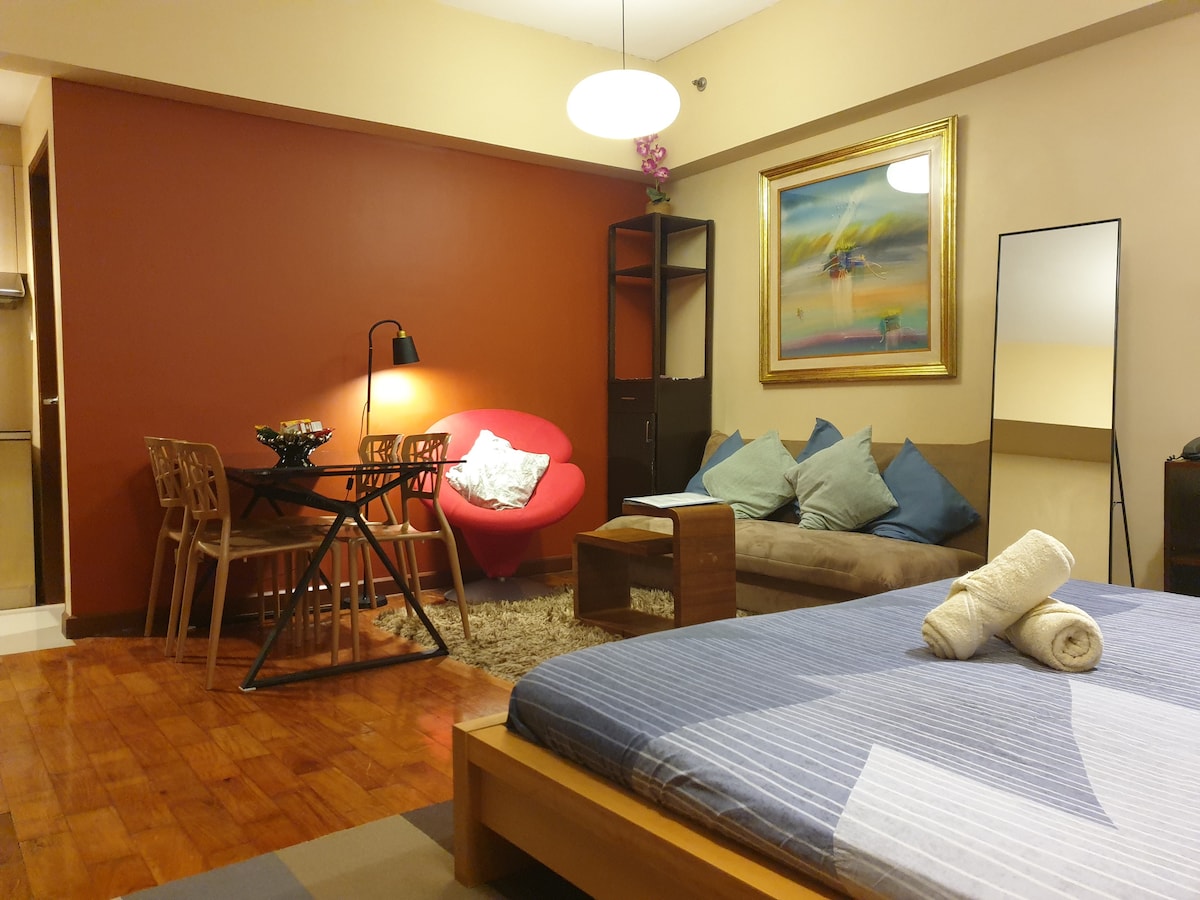 Studio avec un très grand lit situé en plein cœur de Makati, idéal pour les voyageurs d'affaires. À seulement 3 min. à pied de Greenbelt, des bureaux, des restaurants et des centres commerciaux. OFFERT à MOSAIC 10H: ✔ Café ✔ Wi-Fi ultra-rapide ✔ Accès Salle de sport et Piscine ✔ Balcon ✔ Cuisine entièrement équipée ✔ Enregistrement facile en autonomie ✔ Machine à laver ✔ Lit confortable et oreillers de qualité ✔ Produits de toilette ✔ Espace de travail ✔ TV avec Amazon Prime, Netflix et Disney+
