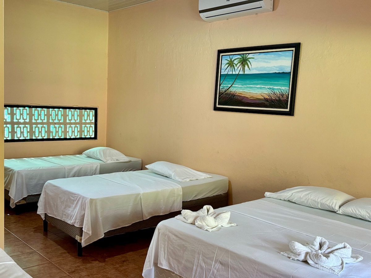 Récemment rénové, grand appartement ouvert (700 pieds carrés) : couchage/salle de bain + coin cuisine/salle à manger/espaces de vie séparés par deux murs voûtés, grande terrasse donnant sur des arbres/plage. Nouveau lit king size, mobilier et appareils avec douche chaude Cet espace comprend également la climatisation, la télévision, une connexion Wi-Fi et un parking. Emplacement idéal juste à l'extérieur du parc national Manuel Antonio et à seulement 100 mètres de la plage et des magasins, restaurants et marchés locaux.
