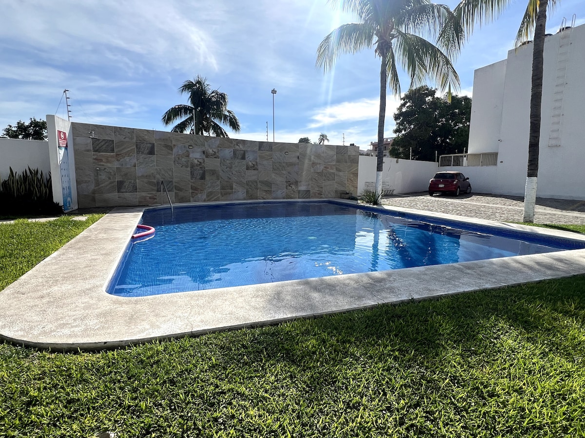 Relájate en esta escapada única y tranquila. Hermoso y cómodo departamento completamente equipado en la mejor zona de Manzanillo a solo 700 metros de la playa. Ubicado cerca de supermercados, antros, restaurantes, cines y centros comerciales. Recamara Principal con aire acondicionado y cama Queen Size. Segunda Recamara con aire acondicionado y 2 camas individuales. Cuenta con Sofá-Cama matrimonial y adicional un espacio individual. Espectacular Alberca con palapa para pasar un rato agradable.