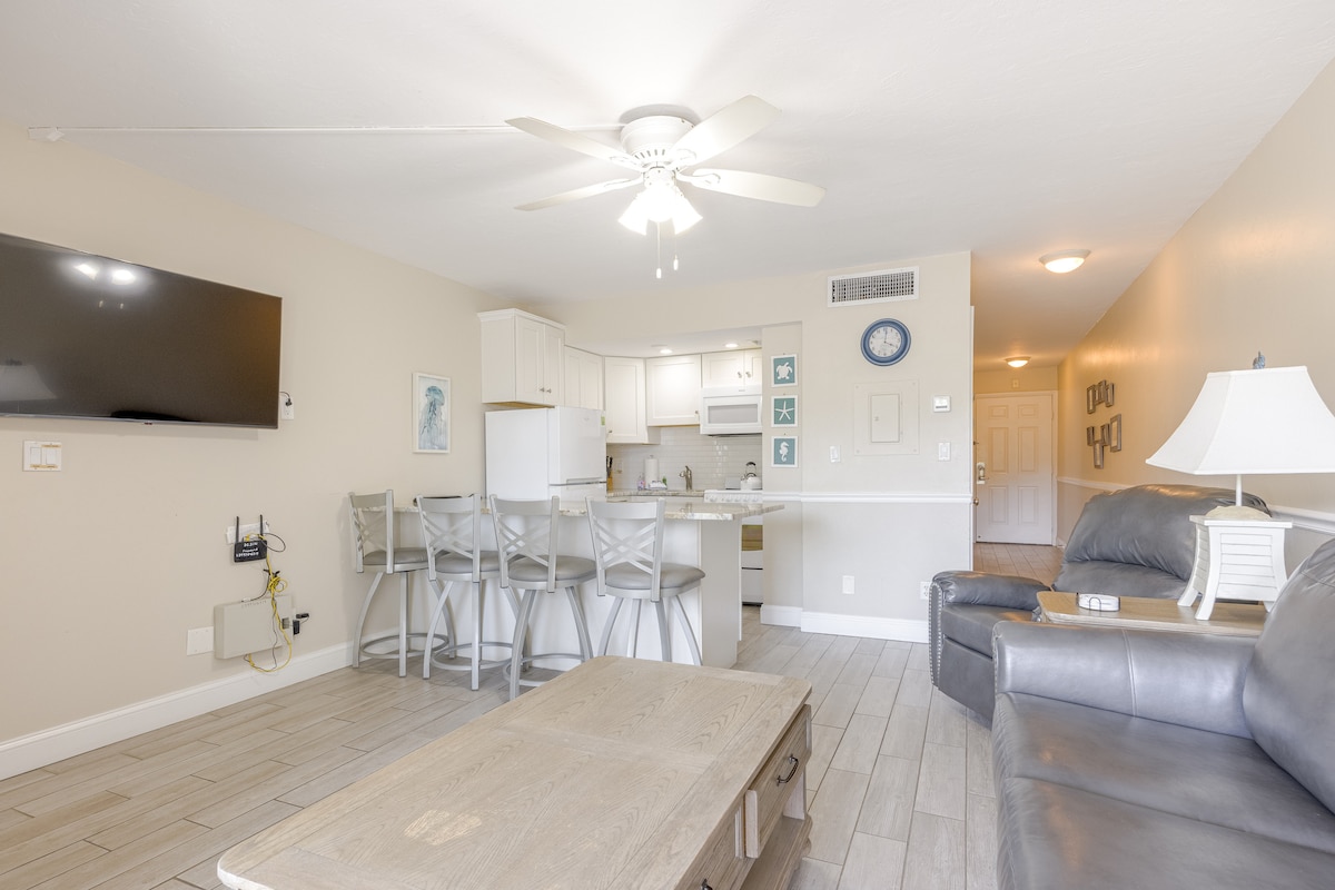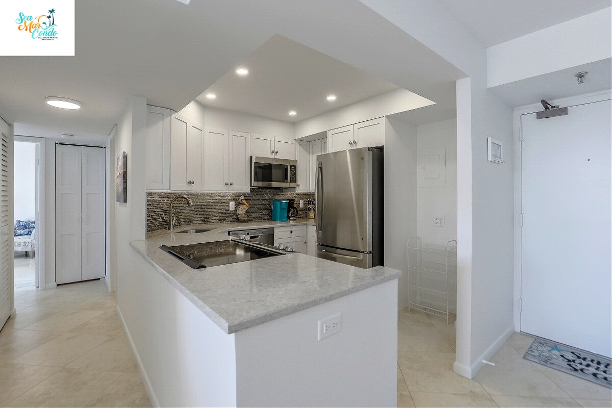 Profitez de notre appartement en copropriété magnifiquement rénové de 2 chambres et 2 salles de bain avec vue sur le golfe du Mexique. Notre unité est confortable, aérée et propre avec beaucoup de lumière naturelle. Nous avons tout ce qu'il faut pour vous sentir chez vous tout en profitant de vos vacances au paradis. Suite parentale avec lit King Size. La deuxième chambre dispose d'un lit Queen Size et de lits jumeaux. Séjour spacieux, lanai grillagé et cuisine moderne. À quelques minutes à pied de la plage, des commerces et des restaurants gastronomiques. Chaises de plage et parasols inclus.