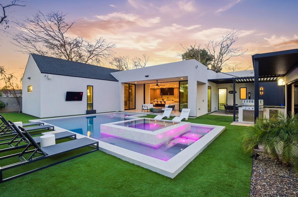 Experience modern luxury and ultimate relaxation at this stylish retreat. The interior is a sophisticated blend of modern design and comfort, featuring an open-concept layout, chef’s kitchen and a sleek billiards table. Step outside to a breathtaking backyard oasis with a heated/chilled pool (with a volleyball net), hot tub, and a putting green. The covered patio offers ample seating, a cozy firepit, and a fully equipped outdoor kitchen with a grille, creating an ideal setting for entertaining.