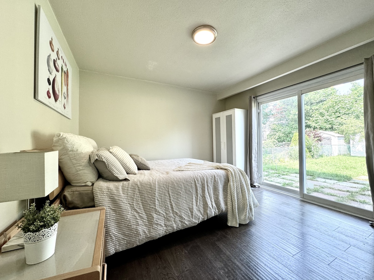 Bienvenue dans notre suite lumineuse et spacieuse au sous-sol de Thornhill! Profitez d'une cour paisible juste à côté du Bayview Golf Club, parfaite pour le café du matin ou pour se détendre après une longue journée. Les voyageurs ont un accès complet à la salle de sport et au cinéma maison pendant leur séjour. La suite dispose de : • Une chambre confortable avec un lit queen • Un canapé-lit confortable dans le salon • Entrée privée et beaucoup de lumière naturelle Nous sommes ravis de vous accueillir et vous souhaitons un excellent séjour !