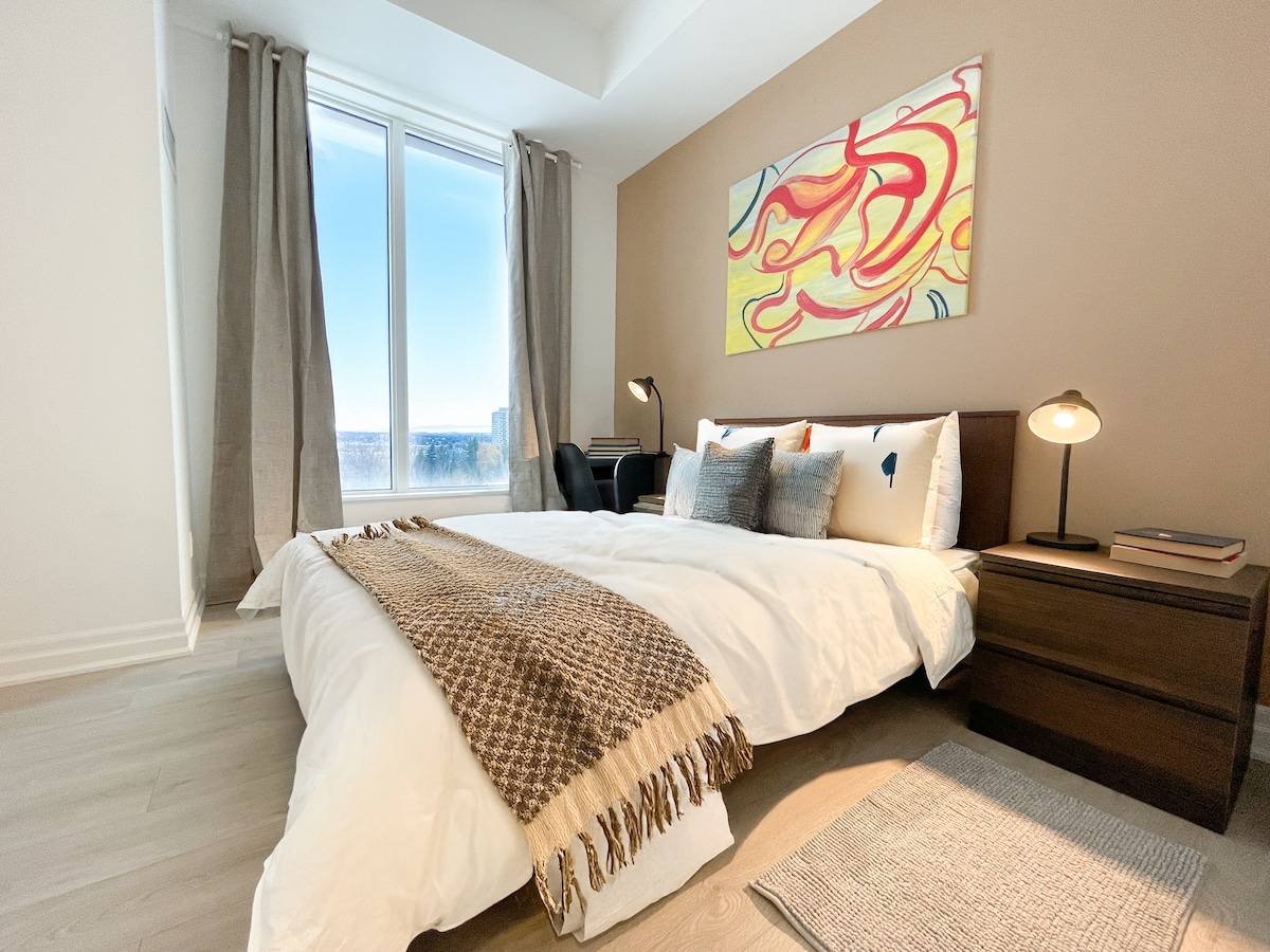 Nouveau Penthouse Condo avec vue imprenable situé au cœur du centre-ville de Markham. Détendez-vous avec des serviettes propres, des couettes douces en duvet, des draps confortables, des articles de toilette, des œuvres d'art personnalisées élégantes et une baignoire. Cette suite comprend une connexion Internet haut débit, un parking privé sur demande et est meublée avec du linge de lit. À proximité des lignes de bus, de la gare GO, des autoroutes 407/404, du centre Pan Am et du campus de Markham de l'Université York. À distance de marche du Cineplex VIP, des restaurants, des bars, du parc, du terrain de tennis et bien d'autres !