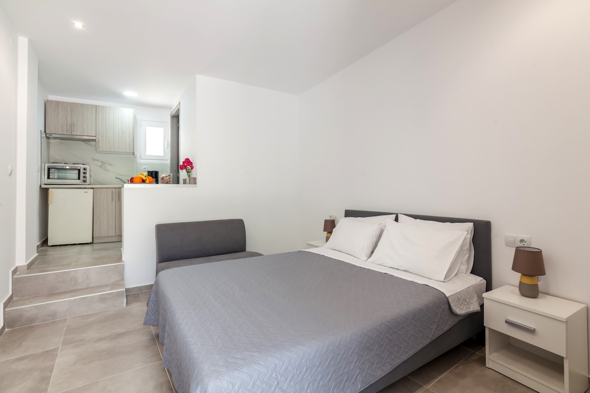 Appartement indépendant au rez-de-chaussée entièrement rénové en plein cœur de Matala. Il est juste à côté de la place principale du village avec un accès instantané à la plage. La maison dispose d'une chambre avec un lit double et d'une cuisine indépendante entièrement équipée avec un espace ouvert. Il y a une petite cour avant où vous pourrez déguster votre petit-déjeuner en plein air. L'appartement est idéal pour deux amis ou un couple.