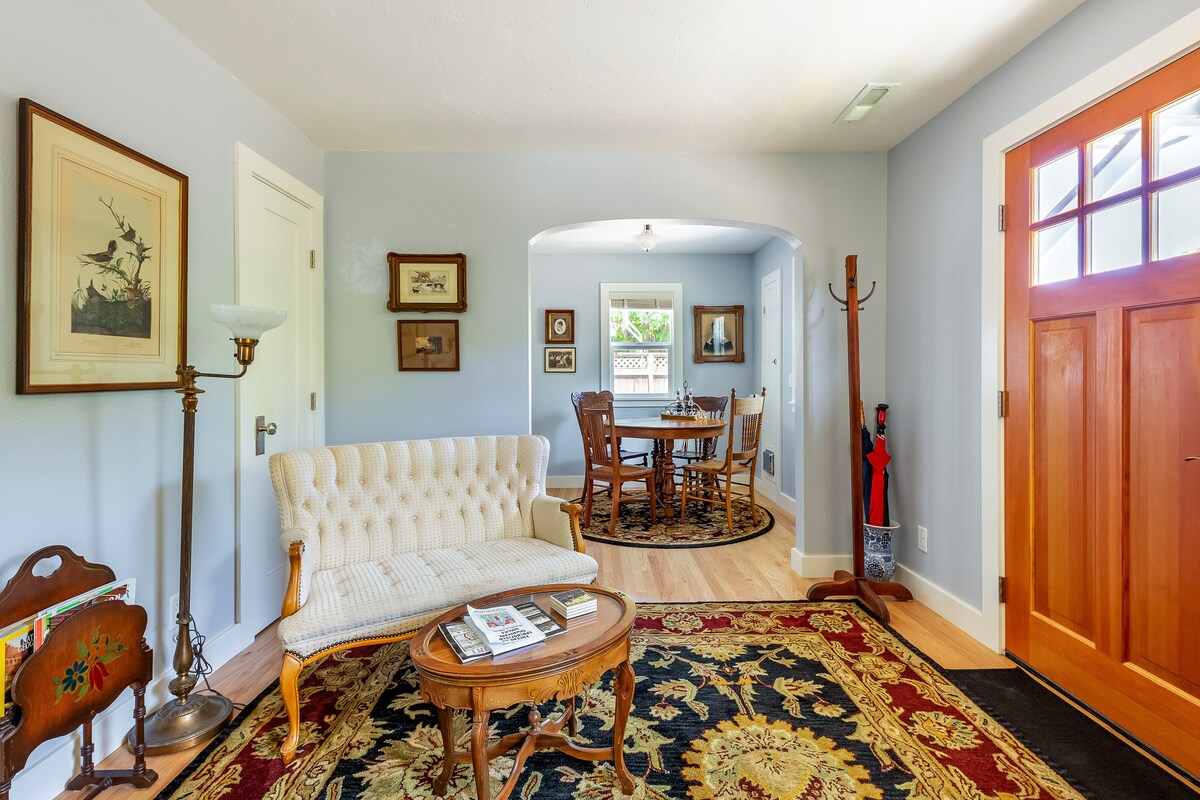 Bienvenue au Midtown Bungalow à Eugene ! Construite en 1930 et entièrement rénovée en 2018, notre maison présente un style vintage avec des équipements modernes et des touches artistiques. À seulement un mile du campus de l'Université de l'Oregon et à quelques pâtés de maisons du centre-ville, notre logement est parfaitement situé pour les familles, les aventuriers et les voyageurs d'affaires. Marchez jusqu'aux restaurants, bars et magasins, détendez-vous près du foyer à gaz sur le patio ombragé, diffusez vos émissions préférées et plongez dans le lit de luxe pour une bonne nuit de sommeil.
