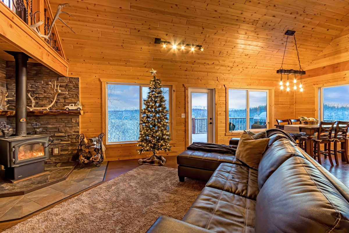 Évadez-vous dans une belle retraite en Alaska nichée sur une falaise surplombant les majestueuses montagnes Talkeetna. Cette propriété de 2 acres dispose d'une grande terrasse avec un jacuzzi pour 4 personnes et un foyer, parfait pour se détendre en fin de journée. Il y a deux chambres confortables, chacune équipée de sa propre télévision, et une salle de bain de type spa pour la détente. Il y a un lave-linge et un sèche-linge, donc vous aurez tout le confort d'un chez-soi. Situé à proximité de lieux de loisirs de plein air comme Hatcher Pass, cet endroit est idéal pour tout le monde.