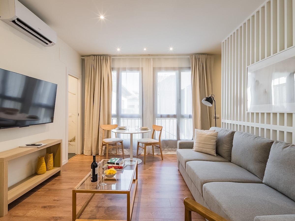 Appartement au niveau de la rue. Idéal pour les voyages d'affaires, les voyages d'études, les séjours médicaux, etc. Avec plaque vitrocéramique, réfrigérateur, lave-linge/sèche-linge, lave-vaisselle, pompe à chaleur/froid, micro-ondes, Nespresso, ustensiles de cuisine complets, bouilloire pour infusions, lit double, canapé-lit 190x150, smart TV, Wi-Fi, alarme, ligne de métro directe pour Sol (15"), grande salle de bain, douche à effet pluie, distributeurs automatiques de gel hydroalcoolique.