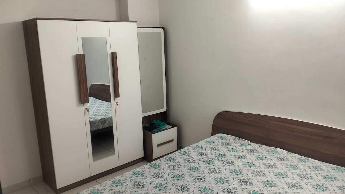 Situé juste en face de l'école et du club au centre de Gift City avec une vue spectaculaire sur les gratte-ciel. Idéal pour les deux mondes, les vacances en famille ou les séjours d'affaires. Emplacement d'angle avant avec toutes les commodités. Il y a la climatisation dans les deux chambres, une connexion Wi-Fi rapide, une table à manger, un geyser dans les deux salles de bain, une télévision intelligente de 43 po, des armoires dans les deux chambres et des ustensiles de cuisine disponibles avec une cuisinière à gaz et une cheminée. C'est un appartement et des meubles nouvellement construits. Alors, profitez-en comme si c'était le vôtre. Pas de viande dans la maison, s'il vous plaît.
