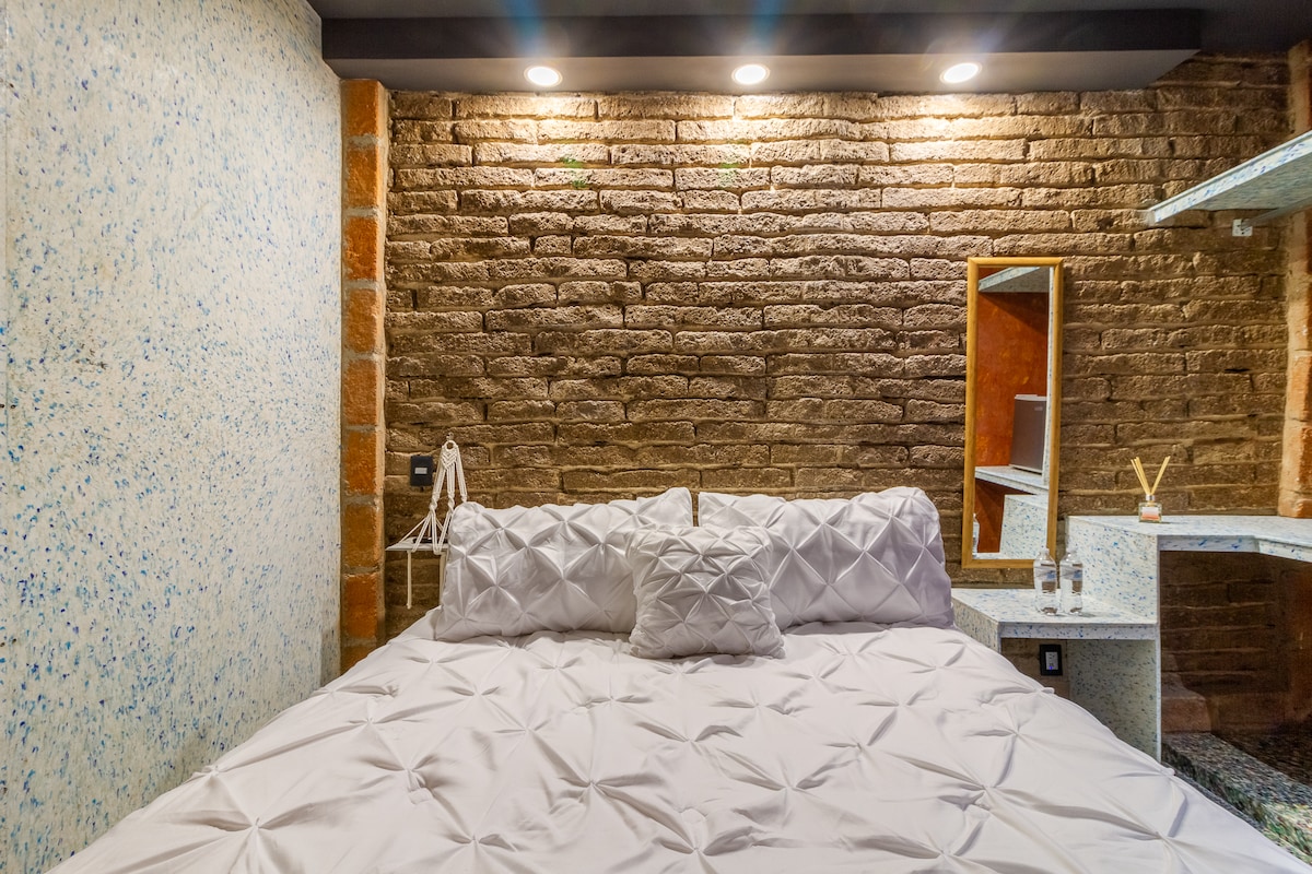 Nous avons 3 chambres de cette catégorie à Casa Ritual; une au rez-de-chaussée et deux au premier étage. La chambre dispose d'un lit queen size, d'un écran plat avec Netflix, de la climatisation, d'un ventilateur de plafond, d'un bureau et d'une chaise au cas où vous viendriez faire du bureau à domicile, d'une vue sur une rue calme et boisée et d'une salle de bain très originale. Venez vous détendre avec nous et laissez-nous vous dorloter!