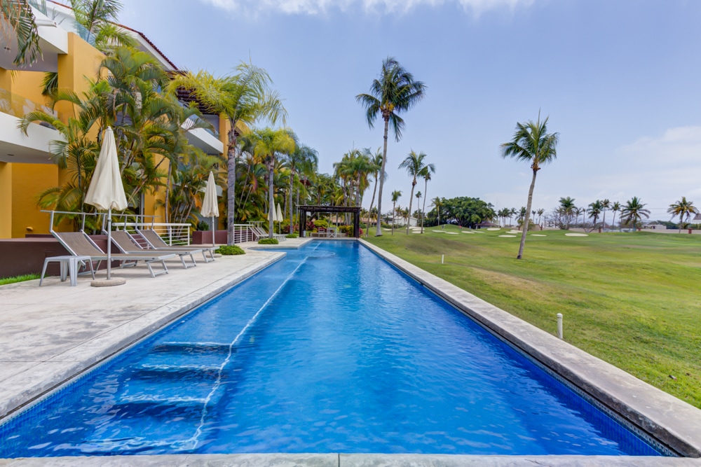 - Accès libre à la piscine commune, au bain à remous, aux chaises longues et au palapa ; - Wifi gratuit, balcon privé avec vue sur la piscine et golf, BBQ et table à manger en plein air - Une cuisine entièrement équipée avec un lave-vaisselle et un lave-linge et un sèche-linge dans l'unité - 4,7 km/3 miles de la plage de Nuevo Vallarta, 4,3 km/2,6 miles à Chedraui - À une courte distance des plages, des épiceries, des boutiques, des restaurants et des tonnes d'activités !