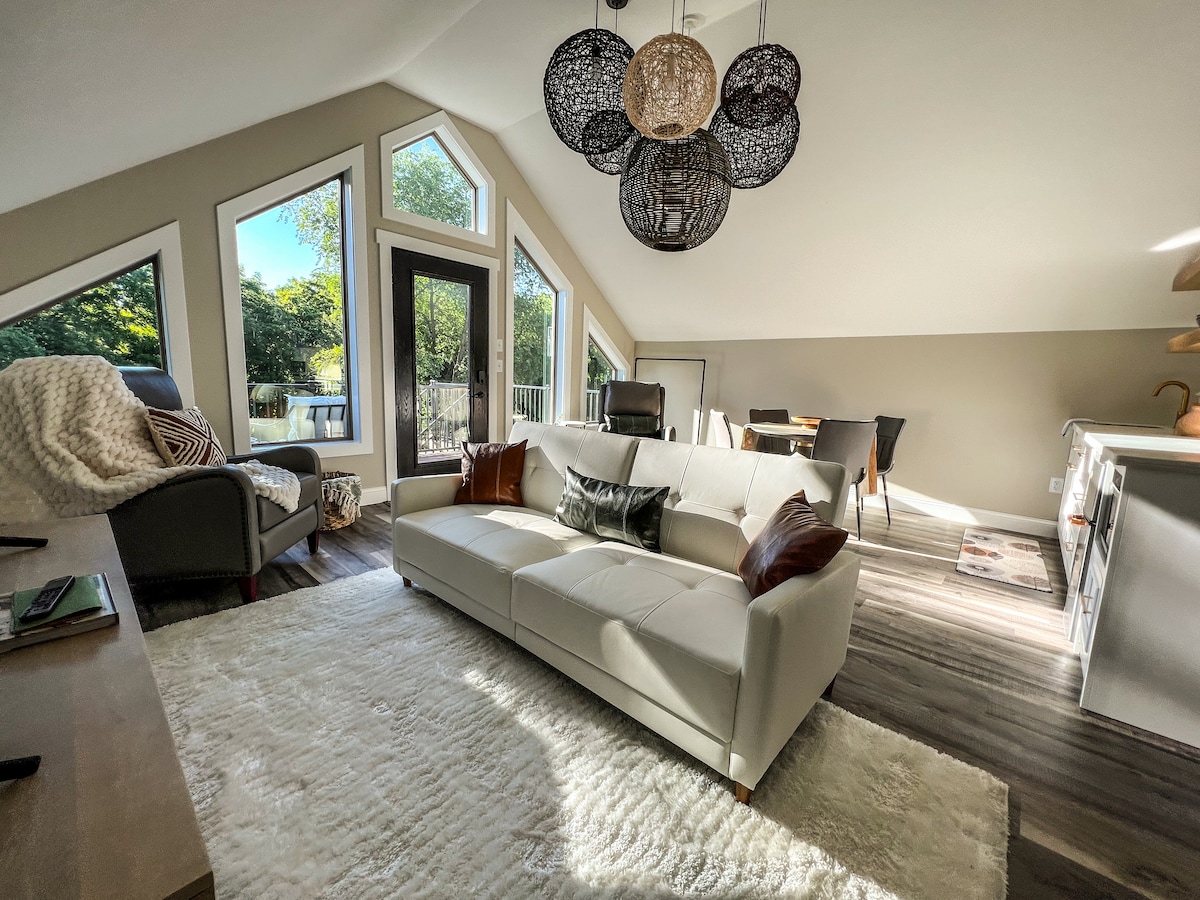 Détendez-vous dans ce logement calme et élégant. Niché parmi les arbres, il offre une escapade tranquille loin du chaos de la vie, vous permettant de vous ressourcer et de vous renouveler. La résidence principale est à environ 400 pieds de la cabane. La cabane est isolée et pourtant proche des attractions locales, des restaurants, des pistes cyclables et des sentiers naturels. Le chalet dispose d'un total de 420 pieds carrés d'espace de vie avec 280 pieds carrés au rez-de-chaussée et un loft de 140 pieds carrés.