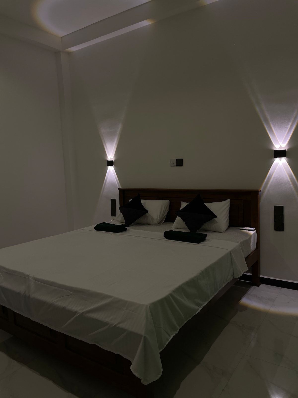 Profitez de votre séjour dans notre maison privée en bord de mer située au cœur du sud de Mirissa. Ce duplex spacieux est parfait pour des amis ou une famille en voyage à la recherche d'un séjour paisible. Dans l'espace L'unité comprend 2 chambres, 2 salles de bains, un canapé-lit et une cuisine moderne entièrement équipée. Le coin repas spacieux est adjacent avec une grande table pour six personnes. Le mur gris se marie avec les coussins bleu paon, créant ainsi une atmosphère chaleureuse dans le séjour où vous pourrez passer de nombreux moments de qualité.
