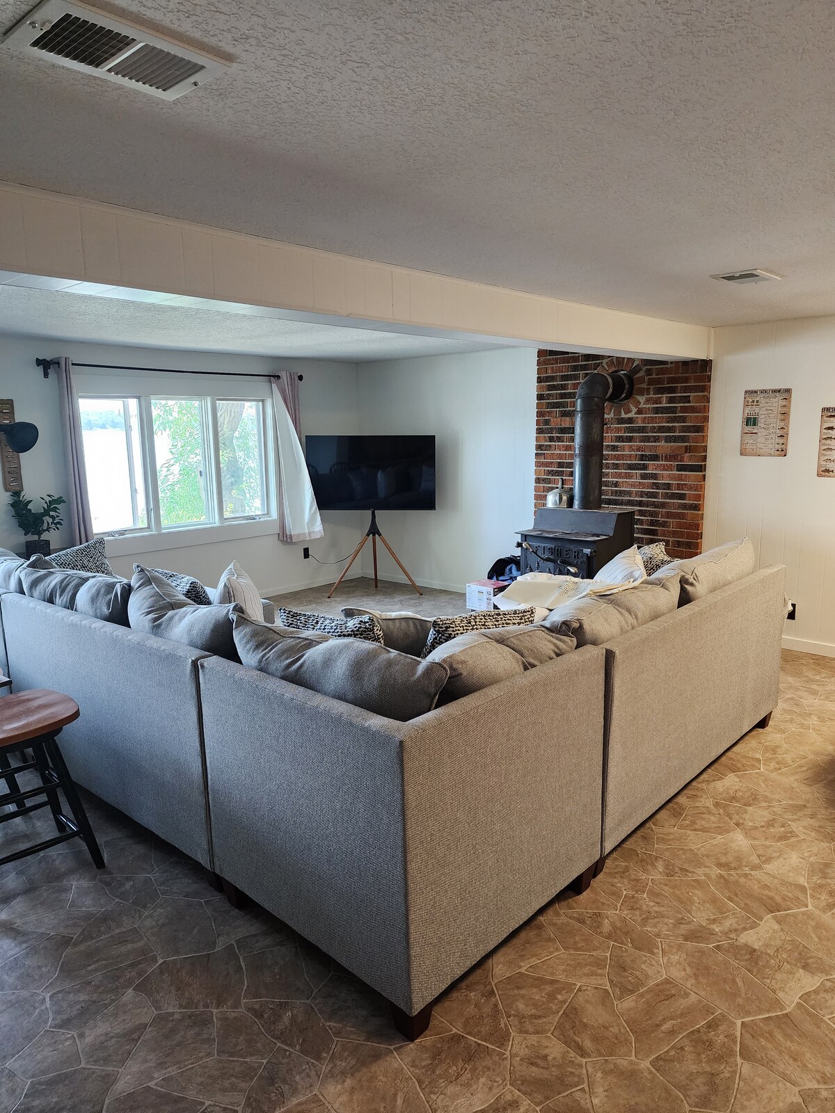 Salle de vie joliment meublée avec meubles en cuir. Quai avec sièges , patio avec table de pique-nique, foyer et barbecue à gaz. La propriété est adjacente à la mise à l'eau du bateau. Beaucoup de zones herbeuses pour le plaisir, jeux extérieurs. La cuisine est bien meublée : lave-vaisselle, four, cuisinière, réfrigérateur-congélateur, casserole, four à pizza, mixeur, micro-ondes, vaisselle, ustensiles, cafetière et plus encore. Bien que les lits disponibles disent « canapé-lit », il s'agit d'un matelas gonflable queen size