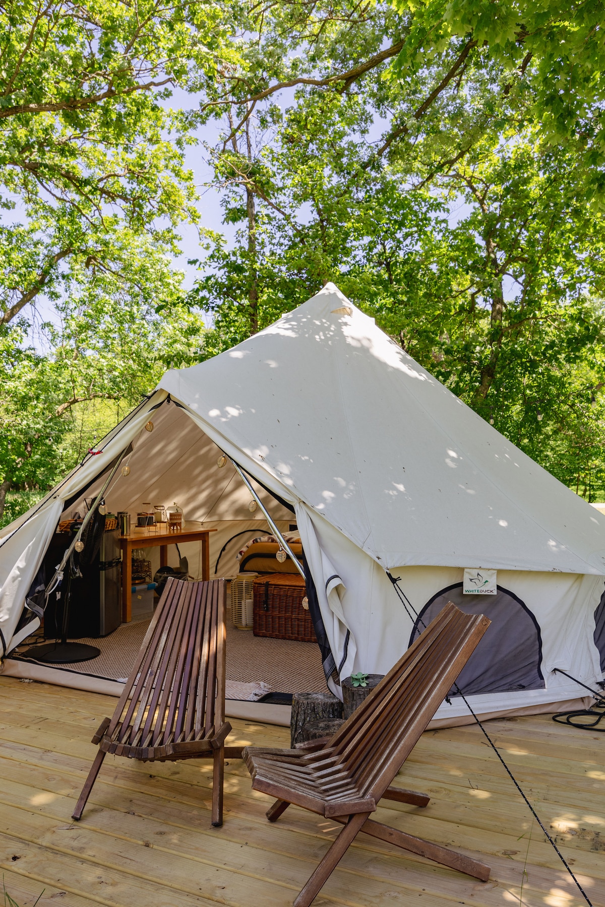 Tente de glamping safari confortable dans un petit complexe au bord d'un lac
